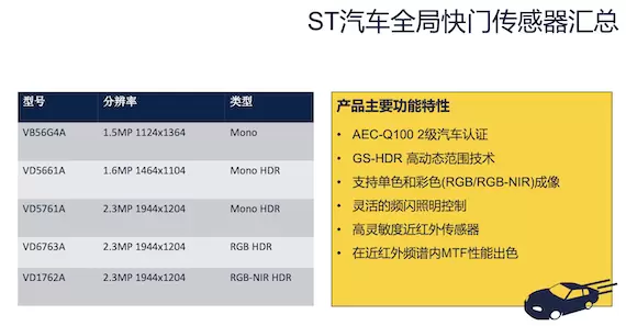 针对汽车领域,客舱占用监控需要RGB彩色图像,驾驶员监控则需要NIR图像,目前仅需单个摄像头就可以同时支持RGB和NIR。意法半导体的全局快门传感器现在提供的两代产品就能够满足车内监控的需求。
