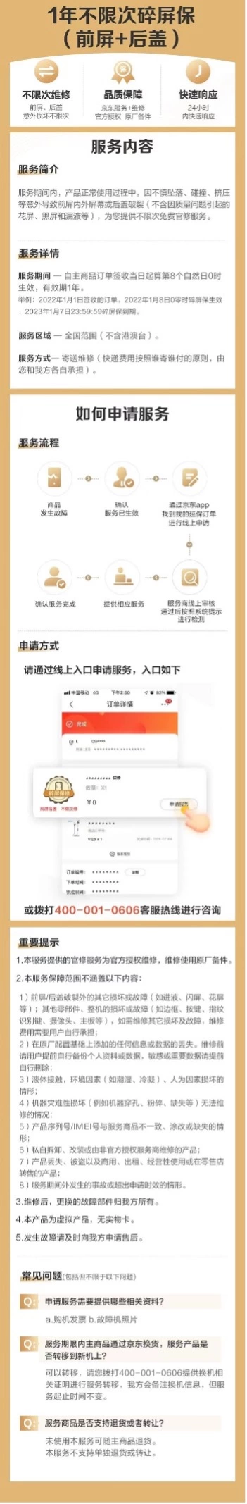 值得一提的是,针对裸机爱好者以及“手滑党”,京东还针对天玑版推出了加99元得全年不限次碎屏保服务,只要在正常使用过程中因不慎坠落、碰撞、挤压等意外导致前屏内外屏幕或后盖破裂,都可以获得免费的官方授权原厂备件维修,不限次数,24小时内快速响应,售后不必等太久。