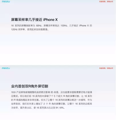 魅族16系列采用全新定制对称式全面屏,屏幕比例为18:9,屏幕的刷新率为60Hz,屏幕采样率高达100Hz,几乎接近iPhone X的120Hz采样率,操控更加顺滑。此外,魅族16系列在内屏5个超大R角屏幕切割的基础上,在外屏上新增了2个R角屏幕切割,使得魅族16系列屏占比提升至91.18%,与vivo NEX相当。