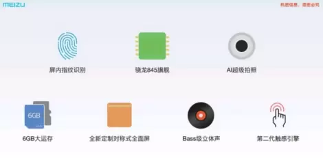 从该博主放出的资料图可以看到,此次魅族16主打骁龙845处理器、屏内指纹识别、AI超级拍照三大卖点。此外还包括6GB大运存、定制对称式全面屏、Bass级立体声、第二代触感引擎等核心卖点,可谓赚足了眼球。