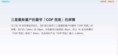 屏幕工艺上,魅族16系列采用COF封装工艺,并且使用了三星最新量产的最窄“COF宽度”的屏幕,传统的COF封装宽度在46mm以上,但魅族16系列仅40mm,确保了整机的超窄边框和超高屏占比。