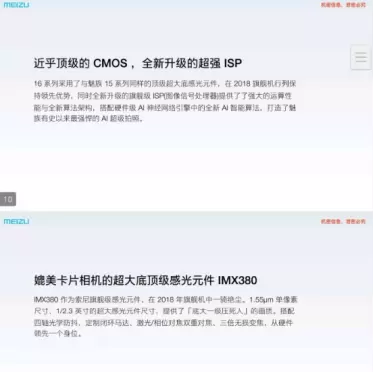 另一大核心卖点是拍照技术,该博主透露,魅族16系列采用了魅族15系列相同的超大底顶级感光元件IMX380,1.55μm单像素尺寸,同时还具备四轴光学防抖、激光/相位双重对焦等技术,拍照更加清晰顺畅。前置摄像头采用了全球最小的2000W像素模组,进一步收窄了额头,同时配合前置虚化、AI智能美颜技术,提升了自拍体验。