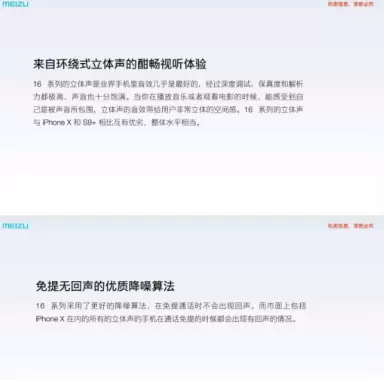 魅族一直强调“声学”体验,此次魅族16系列或采用环绕立体声扬声器,整体听感与iPhone X和三星S9+相当。同时利用免提无回声的降噪算法、听筒与喇叭二合一等技术,无论开免提还是听筒接听,都能保证清晰的通话体验。