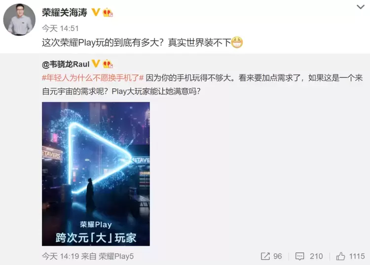 目前关于荣耀Play系列发布会有较多猜测,尚不清楚共将发布几款机型,可能有“意外惊喜”。从已有预热动作来看,此次发布会将融入赛博朋克的元宇宙元素,与虚拟偶像深度联动开启“跨次元之旅”。此前,荣耀中国区电商部部长@荣耀关海涛发布微博:“这次荣耀Play玩的到底有多大?真实世界装不下”。