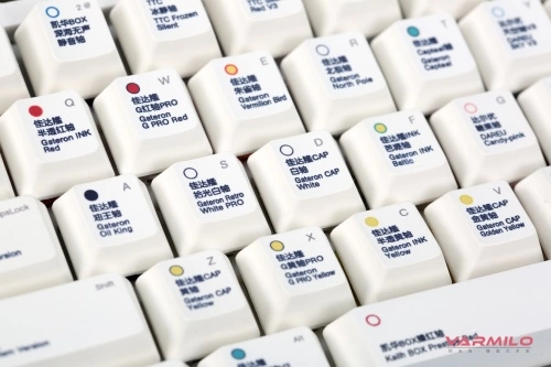 键盘整体采用纯白配色,键帽采用阿米洛一贯的高品质PBT热升华键帽,并且每一把键盘都会有专属编号。与阿米洛其他主题键盘不同,Super Switch采用简约白的主题设计,同时在键帽上印刷不同轴体的中、英名称,以及轴体代表色标识。