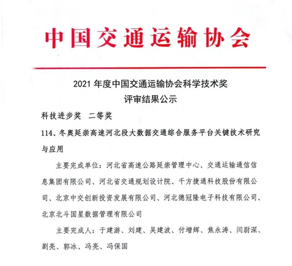 近日,中国交通运输协会公布2021年度科学技术奖评审结果,千方科技参与的“冬奥延崇高速河北段大数据交通综合服务平台关键技术研究与应用”荣获科技进步奖二等奖。