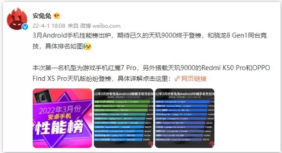 昨天,安兔兔官方发布了3月安卓手机性能排行榜,各大手机品牌均有旗舰机型上榜,但与以往不同的是,在一众高通骁龙8Gen1终端里,搭载天玑9000的OPPO Find X5 Pro天玑版和Redmi K50 Pro成为榜单上的最大亮点。联发科天玑9000没有辜负手机厂商和消费者的期待,凭借硬实力,助力两款量产旗舰终端登上安卓性能榜前十,彻底改变高通骁龙8Gen1在旗舰市场的一家独大局面。