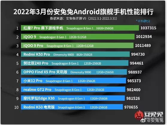 安兔兔3月安卓性能榜单公布,两款天玑9000终端杀入旗舰机性能前十(图源安兔兔)