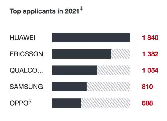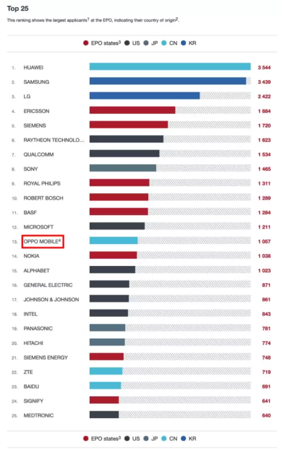 OPPO位列2021年欧洲专利局专利申请量企业排名第13位