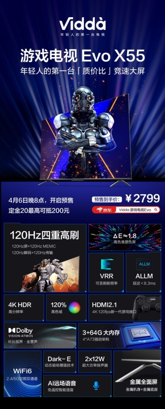 4月6日消息,今晚Vidda通过直播方式正式发布质价比游戏电视Evo X55。新品将为玩家带来电竞级的游戏画面和操控体验,满足专业玩家的苛刻要求。Vidda游戏电视将有55、65、75、85英寸等屏幕尺寸,其中55英寸的Evo X55已经开启预售,4月17日20点京东付尾款首销,售价2799元。目前,X65在京东以3299元现货销售中,X75则以4599元众筹中,4月14日将以4799元首发。