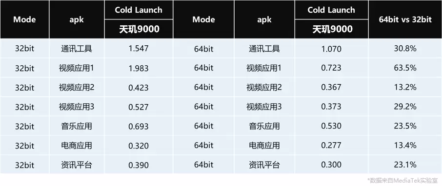 在应用冷启动速度方面,联发科实验室基于天玑9000移动平台进行的测试结果显示,64位应用的冷启动速度相比32位应用快13%-60%。用户在天玑9000终端上体验64位应用,可以明显感知到应用启动速度的提升。