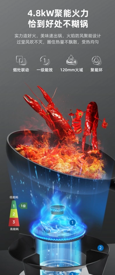 美的左烤右蒸集成灶ZY06具备4.8kw聚能火力,相较市面上其他燃气灶,大火力更猛,能够充分满足用户对于爆炒的需求;另设火焰防风聚能设计,突然有一阵过堂风也吹不灭,高效圈住热量保护好火候,给你恰到好处的火力避免糊锅,随心创作舌尖难忘的佳肴。