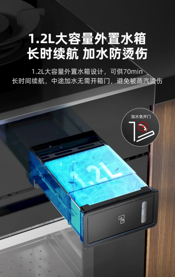美的左烤右蒸集成灶ZY06考虑周到,选用1.2L大容量外置水箱设计,真正实现70min长时间续航,便于产生充足的蒸汽蒸透食物。如果忘记给水箱加水或想长时间蒸制食物,从而遇到烹制中途水箱缺水状况,不需要打开蒸箱门板就可以拿取和加水,有效避免被高温蒸汽烫伤,全方位呵护消费者安全。