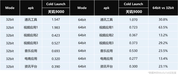在应用冷启动速度方面,联发科实验室基于天玑9000移动平台进行的测试结果显示,64位应用的冷启动速度相比32位应用快13%-60%。用户在天玑9000终端上体验64位应用,可以明显感知到应用启动速度的提升。