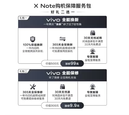 为了让更多发烧友第一时间体验新品,京东联合vivo针对vivo X Note推出先行者计划,参与先行者计划的用户即日起至4月11日20:30期间支付100元定金,并于4月11日21:00-4月12日23:59期间付尾款,即可享受京东提前发货,第一时间尝鲜vivo X Note新品。除此之外,京东针对vivo X Note新品还推出了“全能换新”和“全能保修”服务保障,包括100%保值换新、30天无忧退、365天意外换新等服务,让广大消费者换机更省心。