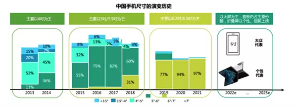 随着高端手机市场更新速度加快,消费者越来越看重产品的创新功能与体验升级。根据GFK发布的行业报告显示,随着手机制造工艺进步,应用场景更为丰富,国内手机市场的屏幕尺寸也在不断变大。从2013年以4英寸屏幕为主流,发展到2021年6.2-6.5英寸为主,消费者对高效、便捷的大屏交互体验需求不断升级。