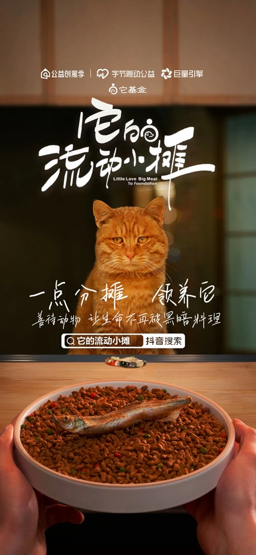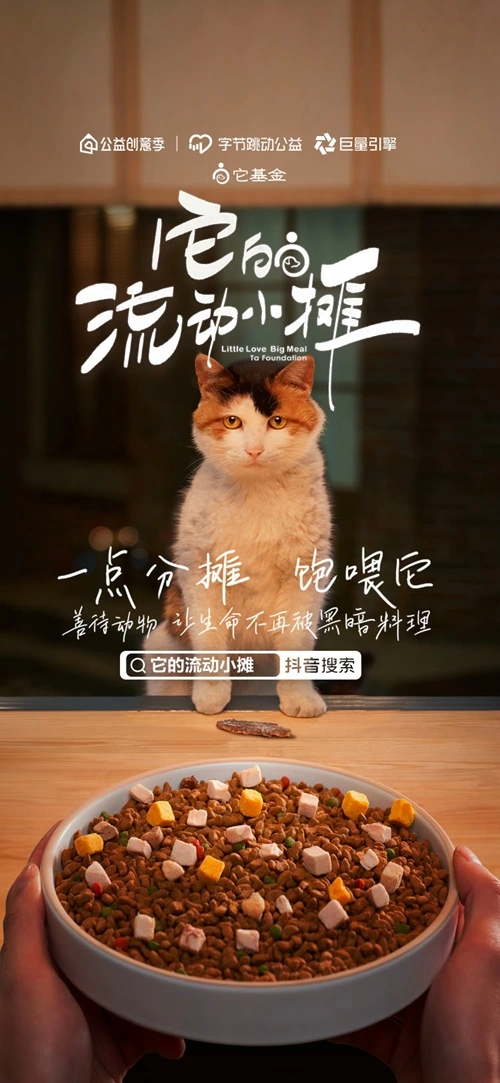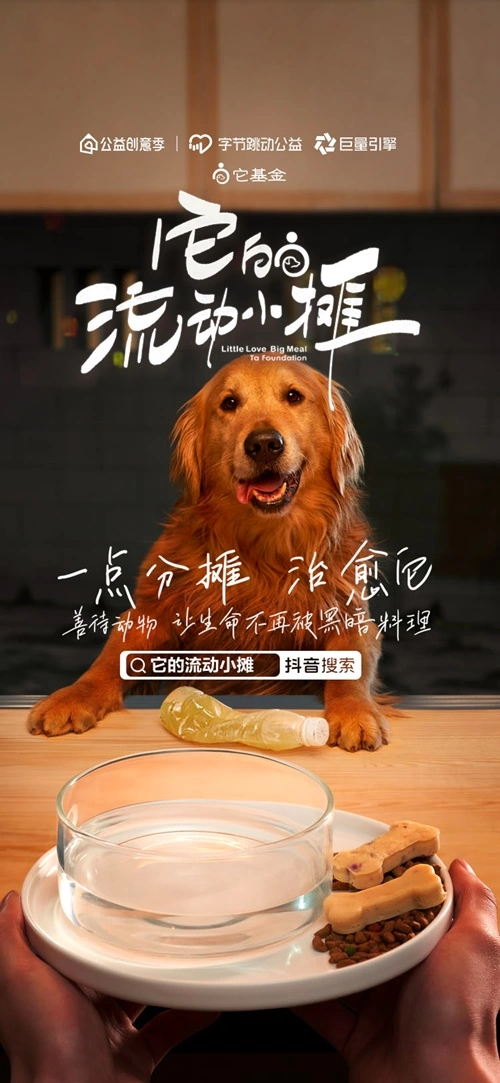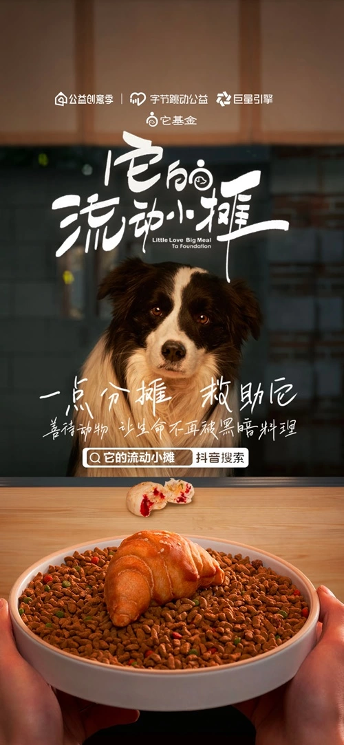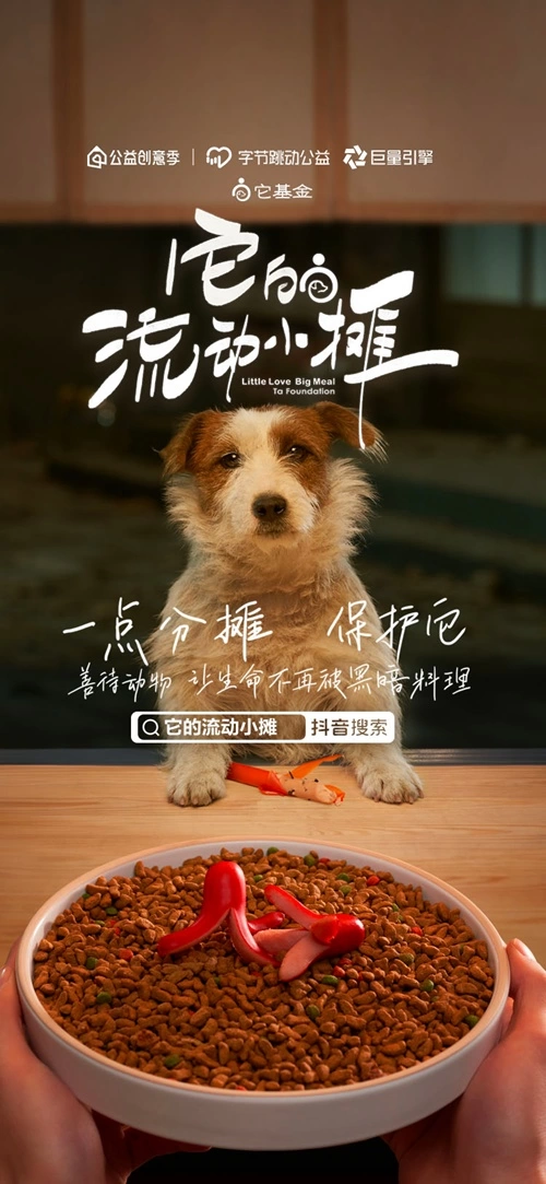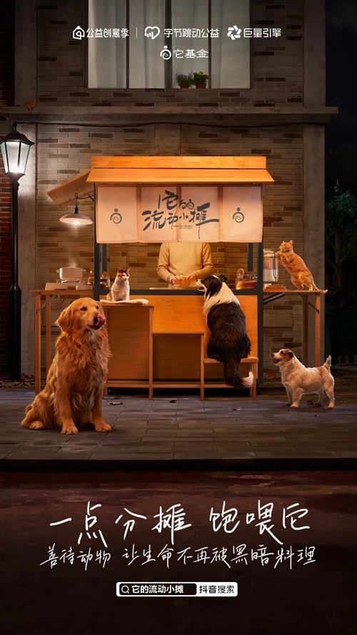 字节跳动公益与巨量引擎携手发起本次“公益创意季”,它基金联合创意机构北京奥美,为善待动物倡行者项目,共同推出创意作品《它的流动小摊》。依托字节跳动公益的平台能力以及巨量引擎平台互动广告、星图达人生态、DOU+等商业化能力助推,《它的流动小摊》以充满创意的“流动小摊”作为舞台,以流浪动物与“摊主”的温情互动作为视觉主线,展示了流浪动物所面临的饥饿、疾病、严寒,虐待等生存困境。通过“让生命不再被黑暗料理”的呼吁,与公众分享“善待动物就是善待我们自己”的精神内核,倡导“一份分摊,饱喂它”的公益行动,通过微小的互动,释放公众对于流浪动物的善意。