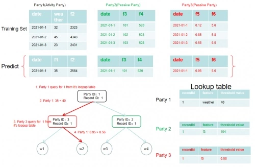 具体在城市用电案例下,由于数据的保密性,联邦学习算法引擎得到的特征都经过脱敏处理。在具体的操作过程中,首先,我们考虑一个具有三个parties(参与方)的系统,如图所示,其中party2和party3为passive parties(被参与动方),party1是一个activity party(主动方)。我们首先通过前述算法训练得到一个树模型,并生成对应的lookup table(查找表)。为了预测在2021年1月1日的用电量,三个参与方将协作工作,由主动方调动被动方完成。首先从根节点开始,通过[party id:1, record id:1]的记录,主动方可以知道其所控制节点的划分,主动方则可通过其对应的查找表找到对应的划分属性和阈值。通过这一过程我们可以发现相应节点是通过属性weather(天气)进行划分的,且划分阈值为40,因此该节点落下左节点,依次类推,一直到达叶子节点。而这个模型通过抽象转化可应用于其他行业的预测领域。通过前述过程可进一步达到去中心化效果,实现数据的跨行业使用,训练过程中无需数据拥有方的直接参与,科研机构即可使用上述能源数据实现跨界的预测算法研究,解决单边数据规模小和标签样本少的问题,同时,也降低了能源数据泄露的几率,提升数据的安全性。
