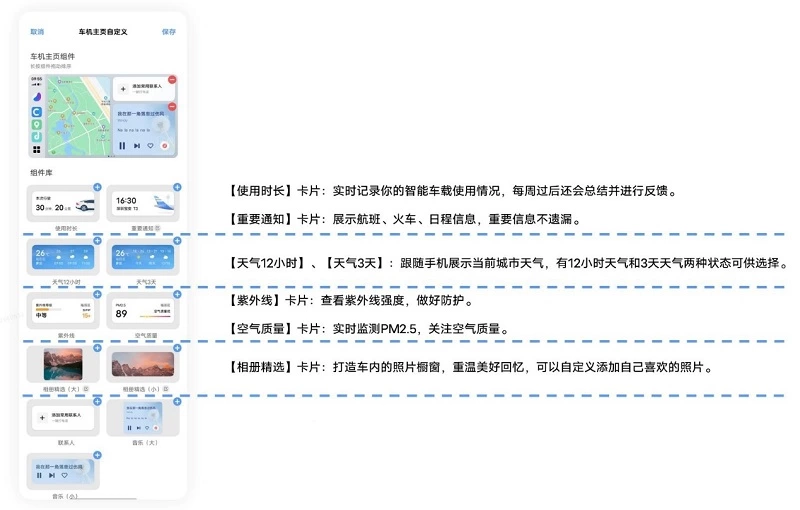 目前,Jovi InCar 2.0车载服务卡片总共包含【使用时长】、【重要通知】、【天气12小时】、【天气3天】、【紫外线】、【空气质量】、【相册精选(大)】、【相册精选(小)】、【联系人】、【音乐(大)】、【音乐(小)】等11张卡片,并将持续丰富