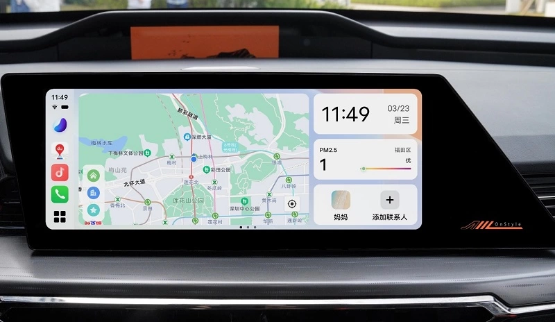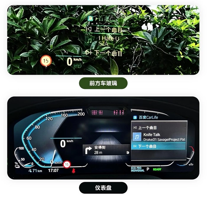 音乐与导航信息(目前仅CarLife+地图显示导航信息)也可以被显示在仪表盘或前方玻璃的HUD显示功能中,帮助行车操作更加方便和安全。