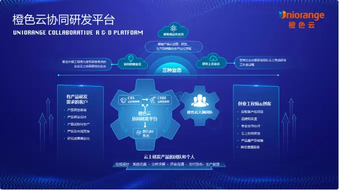 橙色云提出的互联网设计新理念,进一步深化了协同研发设计的场景应用。基于网络化协同、平台化设计等新模式,橙色云推出“协同创新”“研发上云”和“研发商品化”三种新业态,形成橙色云生态链,实现跨行业、跨领域、跨组织的多人线上协同研发生态,并能为用户提供贯穿产品研发需求发布、生产制造、验收交付、销售全业务流程的服务。