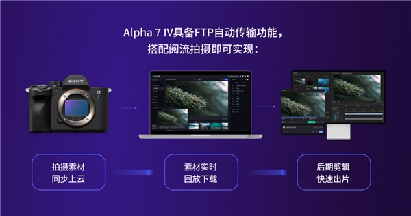 在目前阅流拍摄的合作产品中,Alpha 7 Ⅳ是一台可以实现自动FTP传输*照片及视频文件的微单相机。它不但定义了全画幅新基准,将全画幅相机出色的影像画质和优异性能提升到了更高的水准,同时支持不断增长的远程协作需求,为摄影爱好者和专业用户在不同环境拍摄时提供了更优选。而阅流拍摄的接入则为索尼Alpha 7 Ⅳ用户在不同环境的拍摄中提供了基于云的协作更优解。