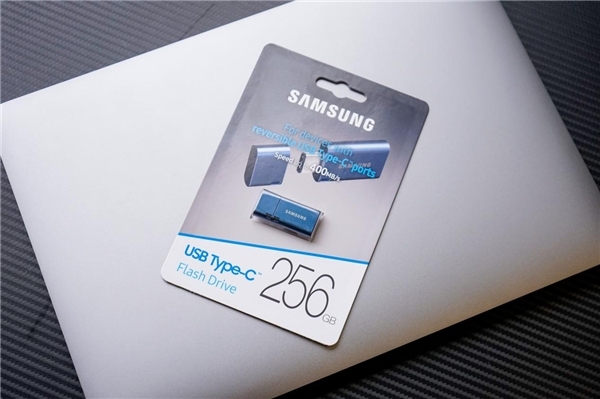 这一款U盘是三星最新推出的USB3.1 Gen1的C口形态设备,在包装上采用了三星国际化的包装风格,带有醒目的“Type-C”以及“256GB”的标识。