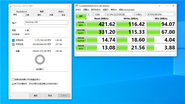 首先是CrystalDiskMark测试,在1G文件的测试中,这款存储卡的写入速度为421.62MB/s,读取速度为116.42MB/s,与官方宣传的类似,甚至还要更高一些。
