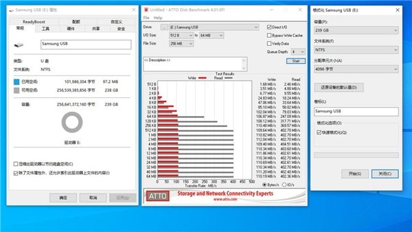 在ATTODiskBenchmark测试中,可以根据不同大小的数据包来检验存储设备在不同文件大小下的读写性能。U盘实际最高读取速度可达404.51MB/s,最高写入速度可达112.04MB/s,且在1-2MB文件时就可以发挥到最大速度,超过32KB时,U盘既可以发挥出102.4MB/s的写入速度,还是非常优秀的,在拷贝、传输一些细碎文件时也可以依然保持高速,避免出现严重的掉速现象。