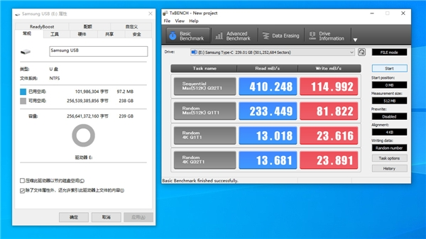 TxBENCH基准测试所得到的结果也和其他同类型测试结果相差不大,读写速度分别为410.248MB/s和114.992MB/s。