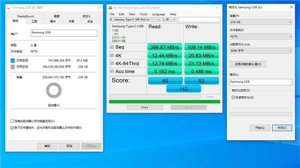 在ASSSD基准性能测试中,1GB数据等级的连续顺序的读写速度为398.87MB/s和109.14MB/s体现出相当高效的读写性能和三星原厂NAND芯片的高性能表现。