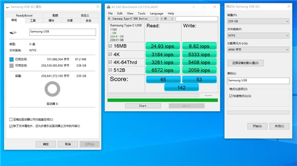 在U盘本身的存储性能部分,其使用了三星原厂的NAND闪存,官方宣称最高支持400MB/s的读取速度与100MB/s的写入速度,使用Type-C USB3.1 Gen1接口(理论最高640MB/s)进行传输。