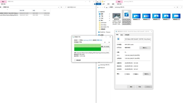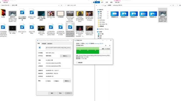 然后,我们进行了一个视频文件的拷贝实测,我们使用的是本次北京冬奥会开幕式的4K高清片源,总大小为21.8G,在写入U盘时可以达到110MB/s的速度、在从U盘拷出时可实现390MB/s的速度,从运行的速度详情图上可以看出,无论是读写,其速度都没有大幅度地降低,可以说是非常稳定了。