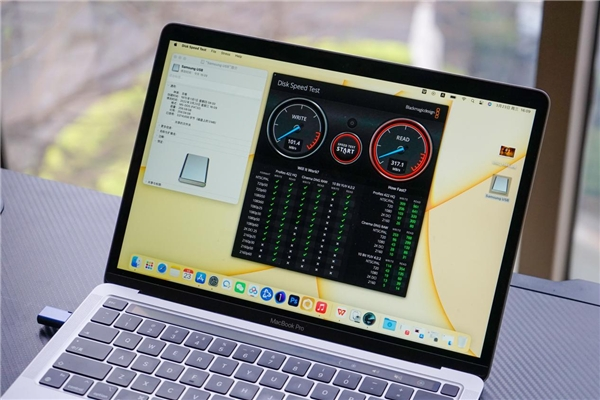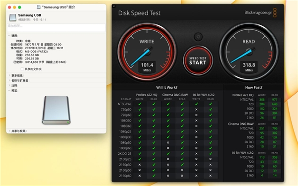 接着,我们连接上Macbook Pro,看看其在Mac OS系统下的速度表现,从实测数据中可以看出,该U盘可以达到连续101.4MB/s的写入能力与318.8MB/s的读取能力。