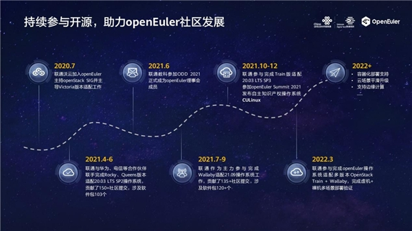 2020年7月联通沃云加入openEuler社区,成为OpenStack SIG首批maintainer及贡献者,深度参与openEuler社区开源贡献及SIG 组日常运作,主导将OpenStackV版移植到openEuler 21.03版本,使openEuler初步实现云化基座。随后持续参与OpenStack在openEuler操作系统的适配工作,先后将R、W、T等版本移植到openEuler 20.03 LTS、openEuler 21.09等版本。联通也积极参与了openEuler 22.03 LTS版本贡献,完成openEuler支持多版本OpenStack适配工作。
