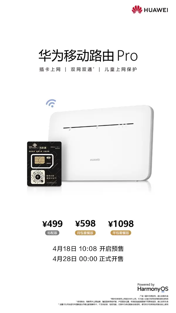 除了以上功能和特性外,华为移动路由Pro还支持与华为Wi-Fi路由器通过HarmonyOS Mesh+组网来进一步扩展Wi-Fi,还有HUAWEI HomeSec实现强大的网络安全保护。华为移动路由Pro标配版(含天际通流量卡,无套餐)售价499元,月包套餐版598元,年包套餐版1098元,感兴趣的朋友不妨赶快加入购物车吧!