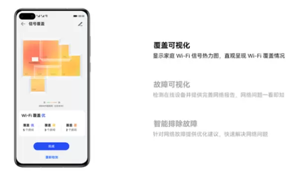 另一个重大软件升级点就是支持可视化智能诊断。不论是SIM卡侧还是Wi-Fi侧的网络使用故障,均可以通过这一功能实现一键诊断。绝大部分无法上网的问题可以实现自动排障,少部分无法上网的问题也会指导用户手动排障。此外,可视化智能诊断功能还支持用户自主编辑户型图,消费者可以在自家户型图中加入华为移动路由Pro,判断路由器的实际Wi-Fi覆盖情况。