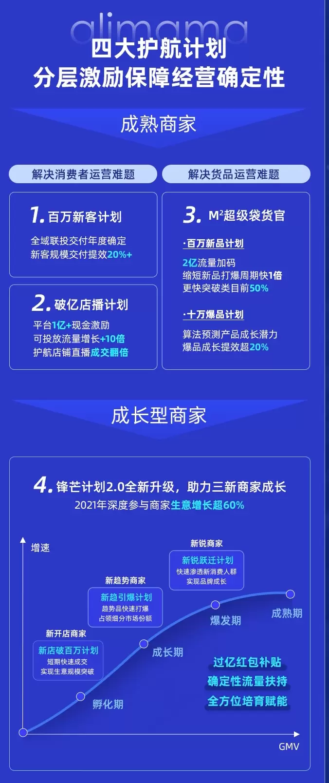记者了解到,聚焦商家日常经营中的新客获取、新品推广、私域建设等日常经营难点,今年阿里妈妈相应推出了四大保障护航计划——百万新客计划、超级袋货官、破亿店播计划以及锋芒计划2.0,帮助商家和品牌抓住自己的时令节点,打造日常营销小高峰。
