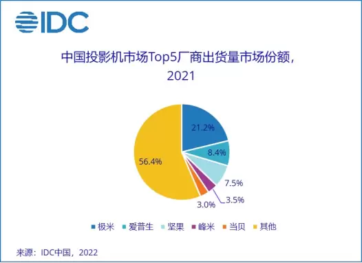 今年三月中旬,IDC发布了最新的《2021年第四季度中国投影机市场跟踪报告》,报告显示,2021年中国投影机市场总出货量为470万台,同比增长12.6%。其中,极米2021年全年出货量占比21.2%,不仅拿下国内投影市场出货量第一,更拉开了与跟随者的差距,市场占有率超过第二到第四名总和。此外,极米高端产品策略效果初显,大幅领先市场。据悉,IDC数据还显示,极米在2021年整体销售额方面也持续蝉联,这意味着极米连续两年成为量和额的双第一。