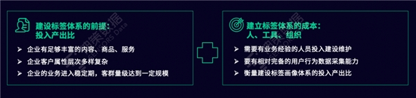 但同时,我们需要清楚地知道,标签体系要想对业务产生价值,需要具备一定的前提条件。比如,有没有足够丰富的内容和商品?如果你的 SKU 只有 10 个,那么通常不需要对客群做细分,也就不太需要标签体系;再比如,你的企业当前处于什么阶段?对于一些初创企业,要想做好标签体系通常需要聘请业务专家,需要采集数据、加工标签的工具,整体下来会花费一大笔资金,但此时如果将这笔资金用来做广告投放或许能够带来更高的收益,所以也就不需要在此时构建标签体系。