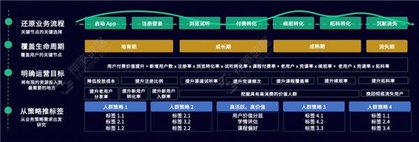 第二步,整合关键节点,定义用户生命周期。包括培育期、成长期、成熟期、流失期。与此同时,对用户做价值分层,辅助目标人群选择。