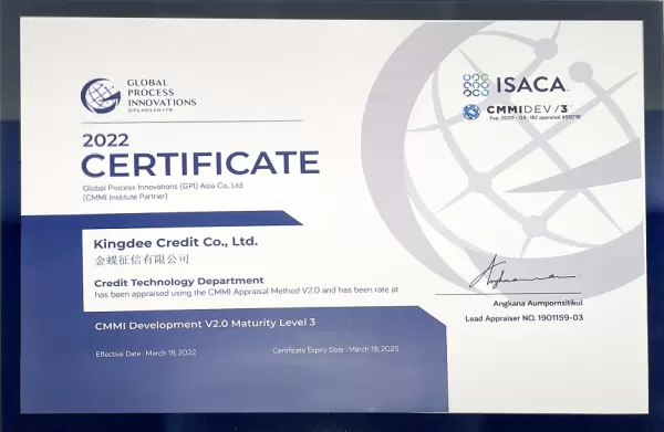 CMMI(全称Capability Maturity Model Integration),即能力成熟度模型集成,是目前世界上公认的针对IT工程管理能力认定的国际标准,也是业内衡量软件企业开发能力及质量的重要标志之一。顺利通过CMMI3级认证,标志着金蝶征信在产品研发、项目管理、服务交付质量等方面的标准化、规范化、成熟度均已达到国际领先标准。