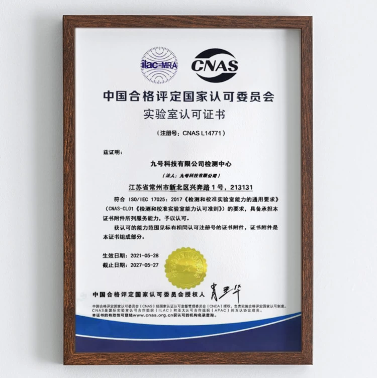 随着消费者对出行产品需求的日益提升,九号在大力发展智能化的同时,不断提高产品质量要求,严把质量关,坚守产品品质,经过长期的积累,九号科技检测中心获得中国合格评定国家认可委员会(简称CNAS)颁发的国家级实验室认可证书。