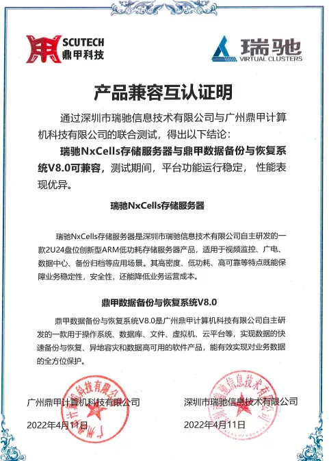 近日,鼎甲科技与瑞驰信息完成产品兼容互认证。本次兼容性互认证经瑞驰信息与鼎甲科技双方联合测试得出:瑞驰NxCells存储服务器与鼎甲数据备份与恢复系统V8.0可兼容,测试期间,平台功能运行稳定,性能表现优异。