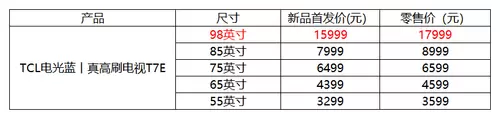 如今TCL T7E真高刷电视已全网开启预售,98英寸零售价17999元,新品首发价只需15999元,其他尺寸同理。小编为了方便大家更清楚明了地看到其它尺寸价格,贴心奉上表格一份!如果想要入手这款真高刷电视的小伙伴们,可以到京东等电商平台搜索TCL T7E,现在预购更便宜哦!