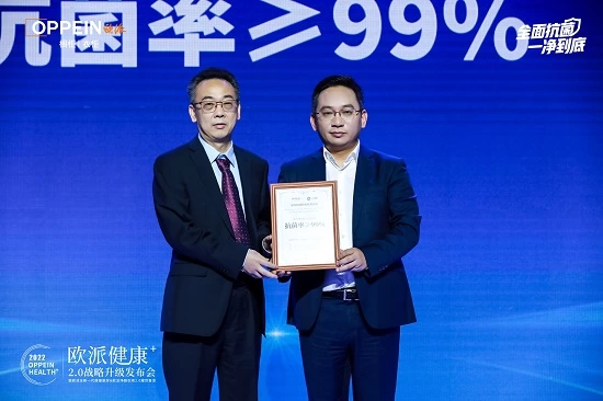发布会当天,欧派健康厨房再一次推出全民普惠升级,全新推出的欧派Health+抗菌台面,采用全新1代光触媒抗菌技术,以科技抗菌、高效抗菌、安全抗菌、持久抗菌四大抗菌核心科技领航技术革新,经过国家权威机构检测认证——抗菌率≥99%,可有效破坏细菌遗传物质,抑制大肠杆菌和金黄色葡萄球菌在厨房的生存繁衍。欧派Health+抗菌台面荣获CIAA抗菌标志使用资格认证,并在发布会上由广东省科学院微生物研究所&广东省抗菌材料与抗菌检测工程技术研究中心主任谢小保先生作为代表,为欧派Health+抗菌台面抗菌率≥99%的检测结果进行证书颁发。