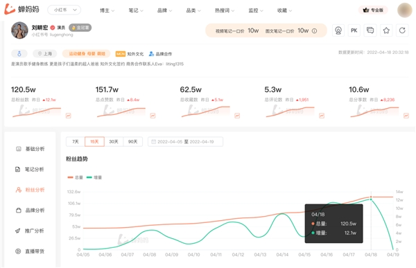 不仅在抖音火,小红书上刘畊宏的涨粉速度也快得惊人。蝉妈妈小红书显示,近15天,刘畊宏涨粉超过80万,笔记数点赞数翻倍,一条笔记的植入价格已经突破10万元。