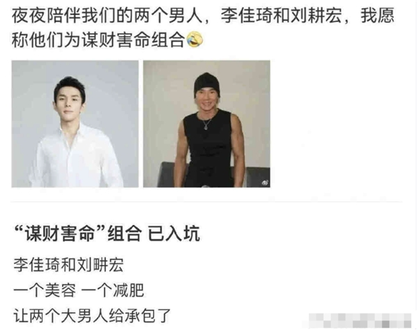 还有网友自称“刘畊宏女孩”,每天开播就跟练,练完就打卡。上一个在女性用户群体备受欢迎的还是李佳琦,所以有网友已经把刘畊宏和李佳琦组成组合,调侃道:“夜夜陪伴我们的两个男人,李佳琦和刘畊宏,我愿称他们为谋财害命组合”,还将#李佳琦刘畊宏组合名#顶上了热搜。