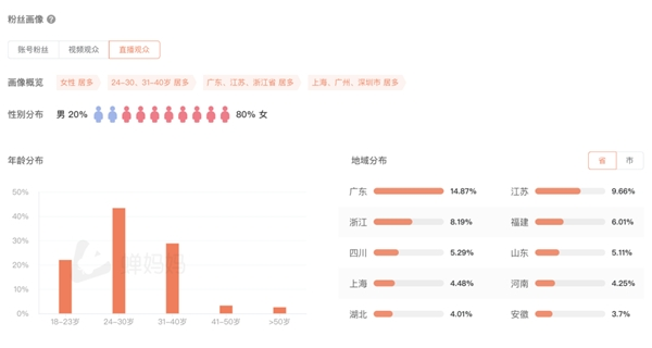 因为刘畊宏的健身直播是垂直内容的直播间,观看直播的用户群体相当精准,通过蝉妈妈可以看到观看刘畊宏直播间的粉丝:80%为女性用户,24~30岁占比43.36%,31~40岁的用户占比28.82%,18~40岁的人群占比达到90%以上,变现空间非常可观。