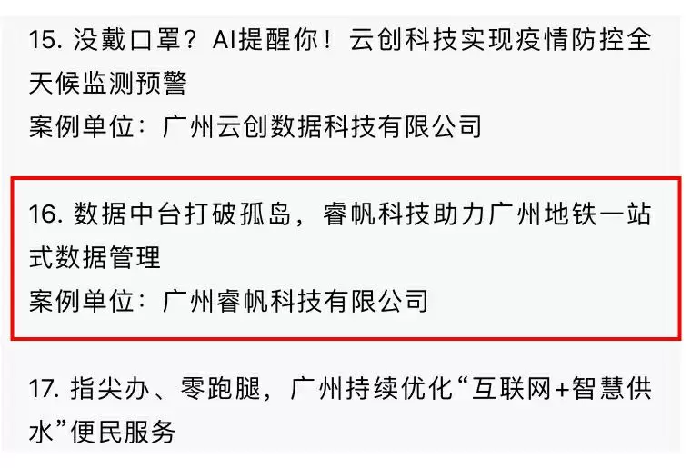 睿帆科技“地铁数据中台解决方案”凭借创新的技术和高效的应用价值,赋能广州地铁一站式数据管理,成功入选湾区数字治理创新案例。